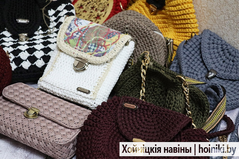 Розныя фасоны, расфарбоўкі, фактуры, затое ўзор аднолькавы – «галачка». Выглядаюць сумкі арыгінальна і дадаюць пэўны шарм, калі прымяраеш іх. Падыходзяць пад любы нарад – паўсядзённы, вячэрні ці спартыўны. Нейкія вырабы выкананы ў адзінай гаме, іншыя дапоўнены ланцужкамі, аплікацыяй або вышыўкай. На адну сумку майстрыха затрачвае каля 4 дзён. Прычым, не заўсёды час залежыць ад памераў сумкі. Бывае, што маленькую робіць даўжэй, чым ёмістую. Ідэальная атмасфера для рукадзелля хайнічанкі – цішыня, бо завесы трэба падлічваць.