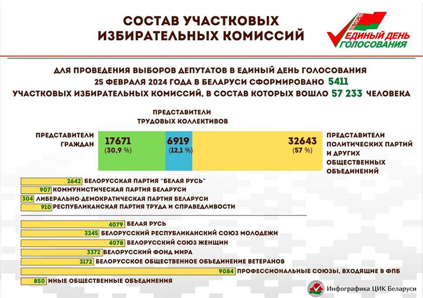 Для проведения выборов депутатов в единый день голосования 25 февраля в Беларуси сформировано 5411 участковых избирательный комиссий, в состав которых вошли 57233 человека.