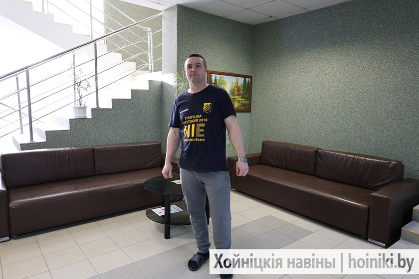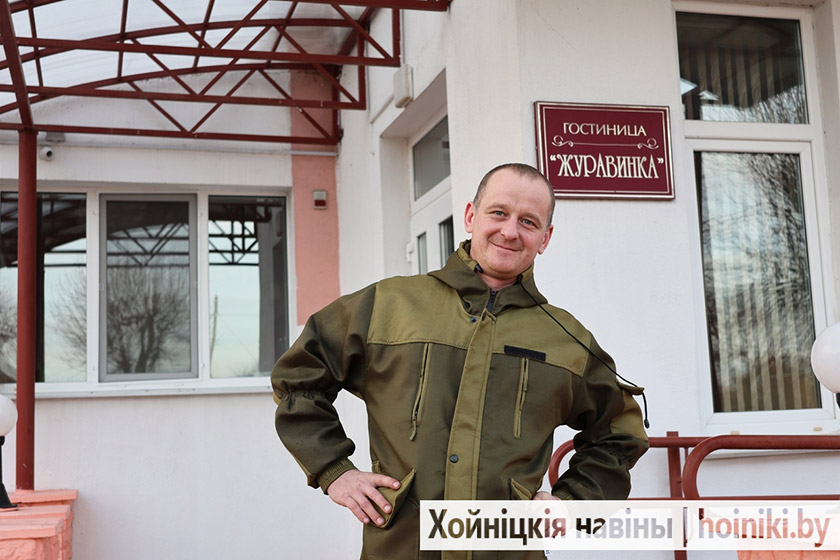 И сразу в фойе нам навстречу вышел брутальный мужчина, который только что заселился – Сергей Глинянский. Он охотно рассказал, что прибыл к нам из Москвы на один день. Приехал на юбилей одноклассницы – подруги детства. И, кстати, родом Сергей из Хойник, учился в третьей городской школе. Сегодня он бизнесмен и долго на малой родине задерживаться не может.