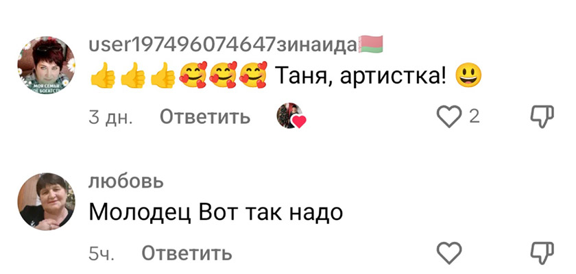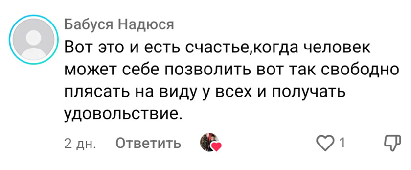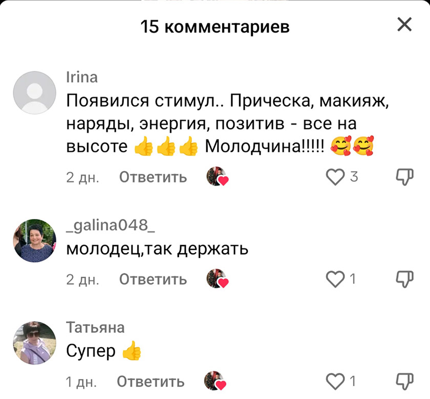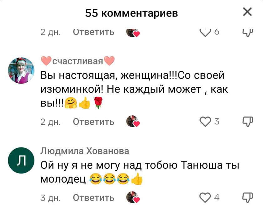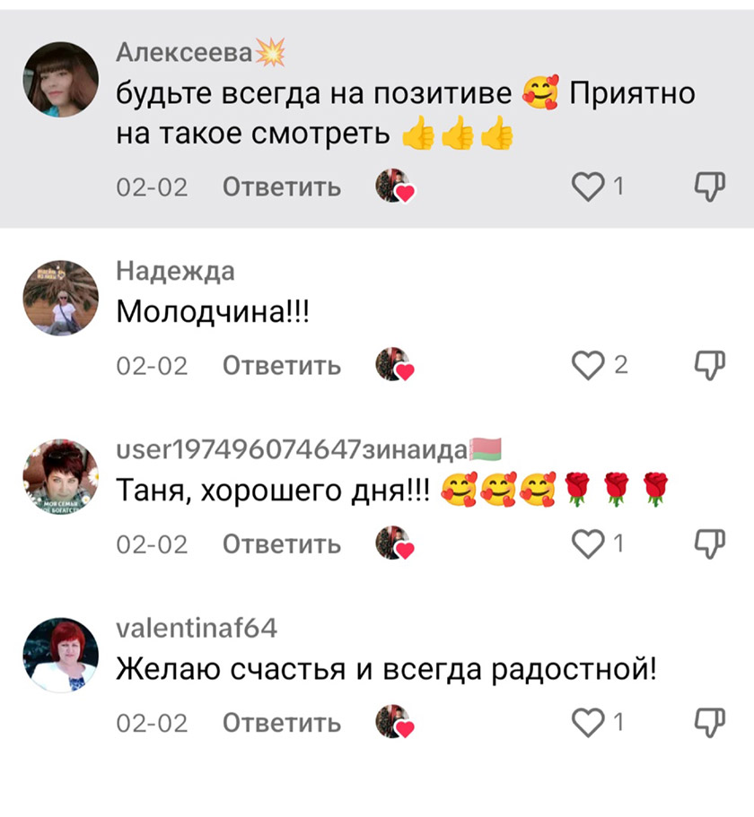– Спасибо. А сколько я приятных комментариев получаю от пользователей! Они меня вдохновляют: «Молодец. Так держать», «Приятно на такое смотреть», «Вы – огонь!», Настоящая женщина. Со своей изюминкой!», «Не каждый может так!». Конечно, есть и негативные, например, что я сошла с ума на старость лет. Стараюсь не обращать внимание на подобные слова. Ведь что плохого в том, что я себе и другим настроение поднимаю? А люди, которые каждого из нас осудят, всегда найдутся.