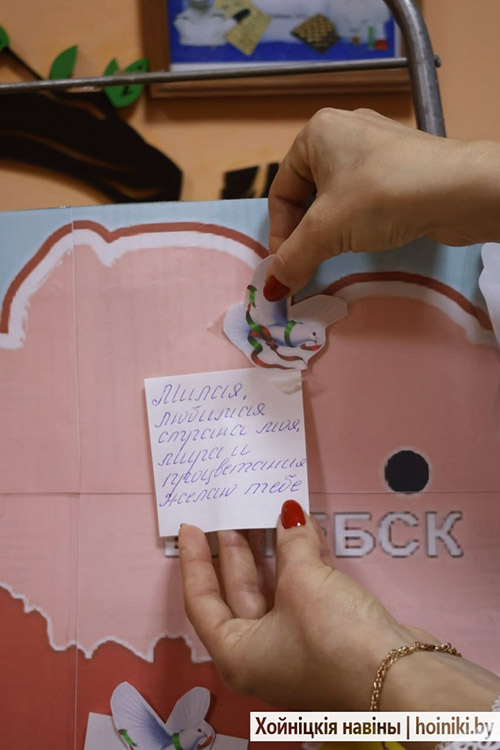 Волонтёры БРСМ предлагают всем желающим написать символическое послание землякам и прикрепить на карту страны.