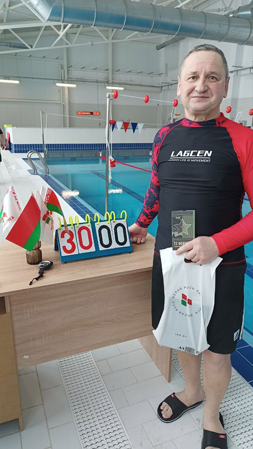 – Свой личный рекорд решил поставить в честь всех тех, кто построил этот замечательный бассейн! Выбрал плыть кролем на груди с погружением головы, вдох – на два гребка, – поделился задумкой Николай Васильевич. – А День защитников Отечества и Вооружённых Сил Республики Беларусь стал отличным поводом реализовать эту идею. Ведь настоящий воин должен быть умным, смелым, а ещё выносливым и сильным.
