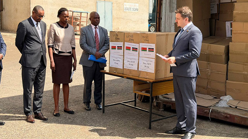 В церемонии передачи белорусской гуманитарной помощи приняли участие Чрезвычайный и Полномочный Посол Беларуси в Кении Дмитрий Красовский и заместитель министра общественных услуг, развития человеческого капитала и специальных программ Кении Исмаил Малим Мадей.