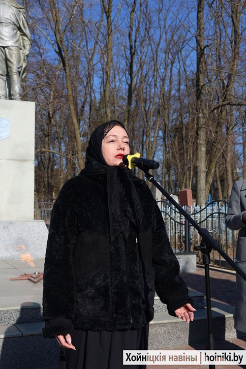 – Мы воспитаны поколением Героев, в наших генах — духовность и несломленность, в нашем памяти – «каждый третий». Нам завещано беречь отвоёванный мир и никогда не позволить повториться ржавой беде под названием фашизм, – обратилась к собравшимся председатель районного Совета депутатов, лидер районного отделения партии «Белая Русь» Людмила Рудченко. – Говоря о Хатыни, мы поминаем десятки сожжённых деревень Хойникщины, три из которых больше никогда не оживших – Зелёный Гай, Красномайск и Перевесье. Мы помним!