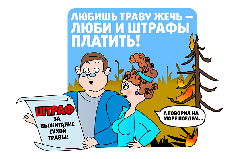 Согласно статье 16.40 КоАП за незаконное выжигание сухой растительности, трав на корню, а также стерни и пожнивных остатков на полях либо непринятие мер по ликвидации палов виновные лица привлекаются к административной ответственности в виде штрафа в размере от 10 до 30 базовых величин. В соответствии со статьёй 16.41 за разведение костров в запрещённых местах предусмотрено наложение штрафа до 12 базовых величин. В случае причинения ущерба в особо крупном размере наступает уголовная ответственность.