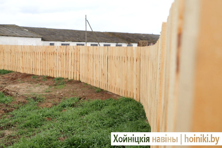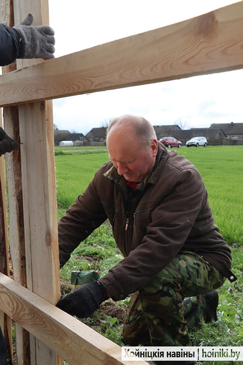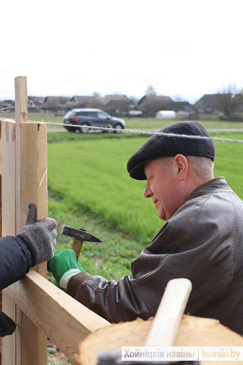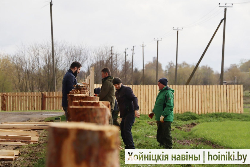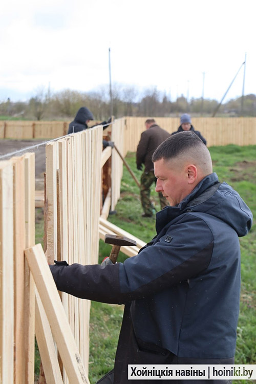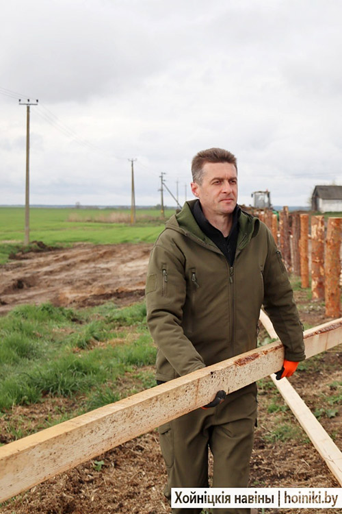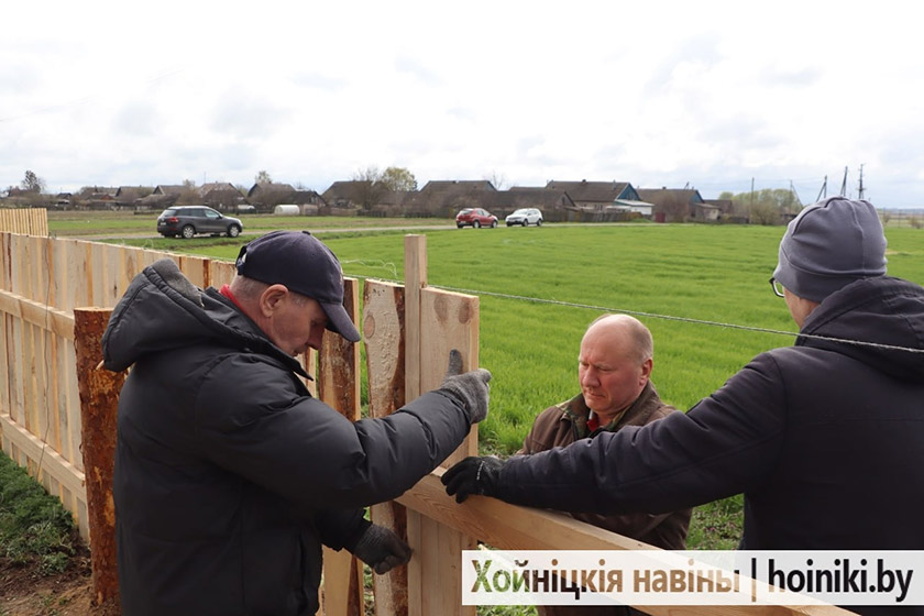 Председатель райисполкома Дмитрий Шпиганович во время республиканского субботника вместе с коллегами продолжают установку ограждения на территории одной из ферм КСУП «Эксбаза «Стреличево».