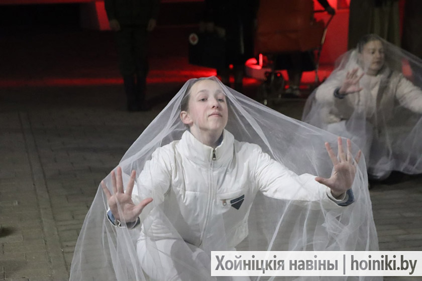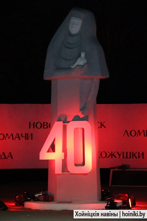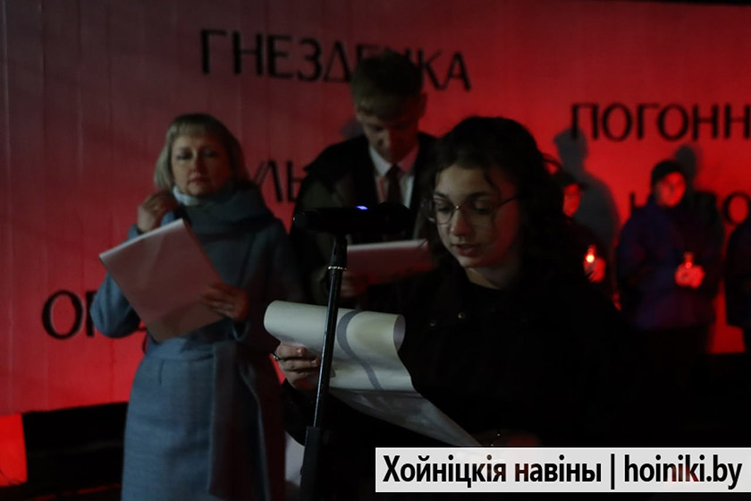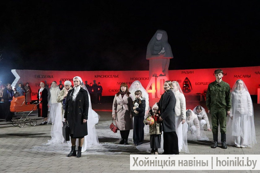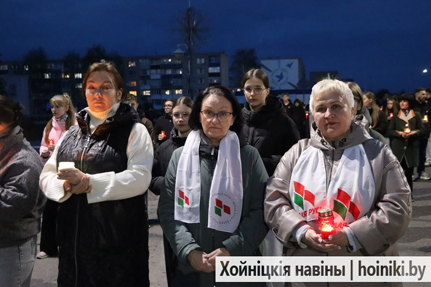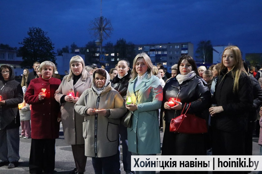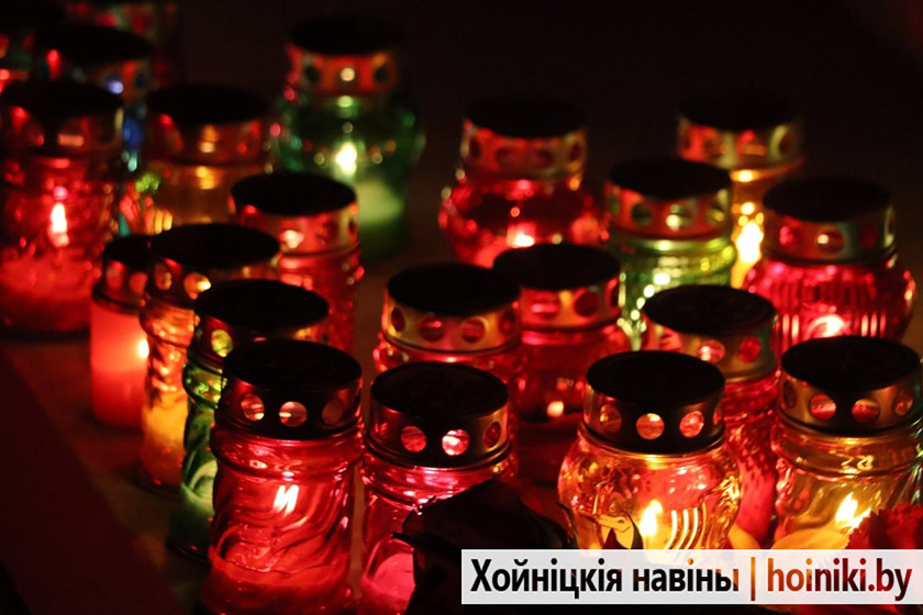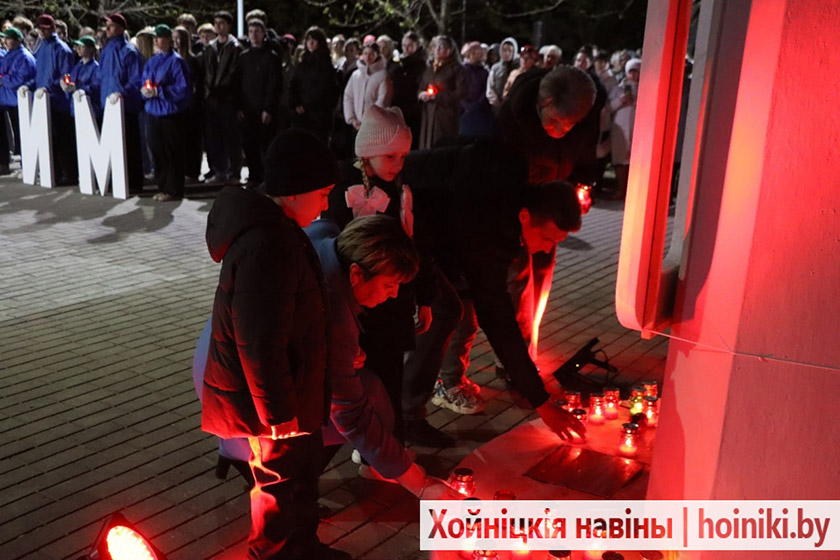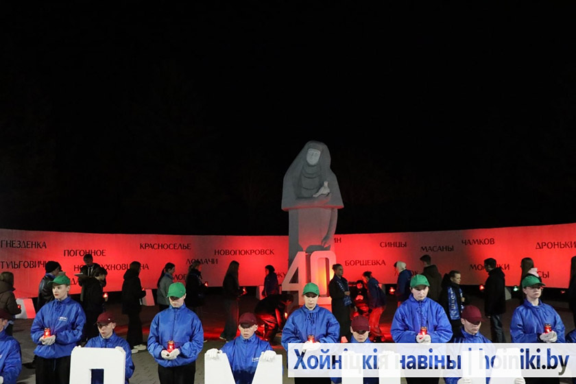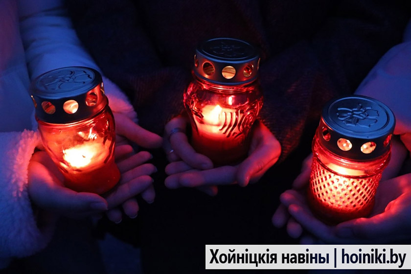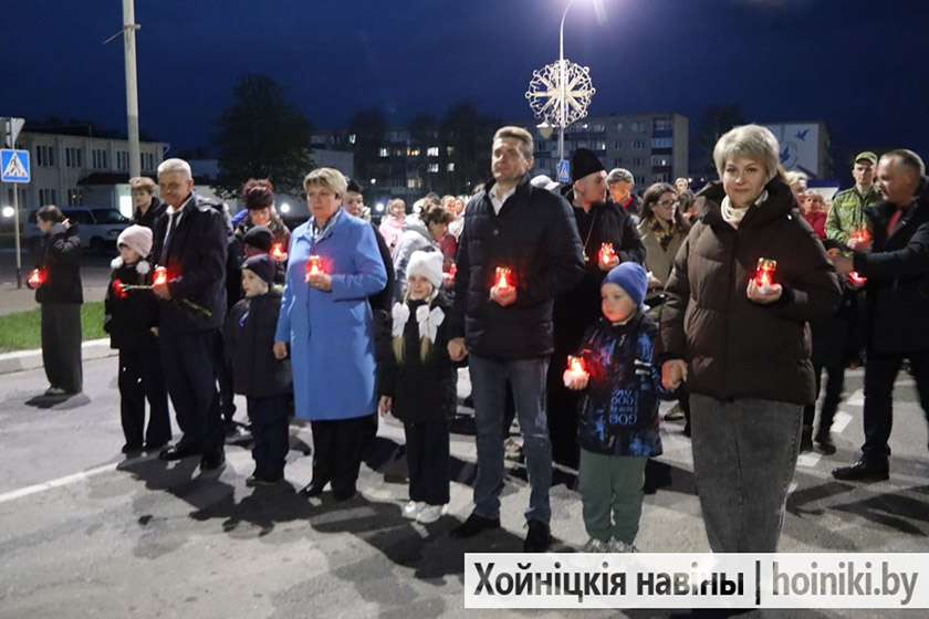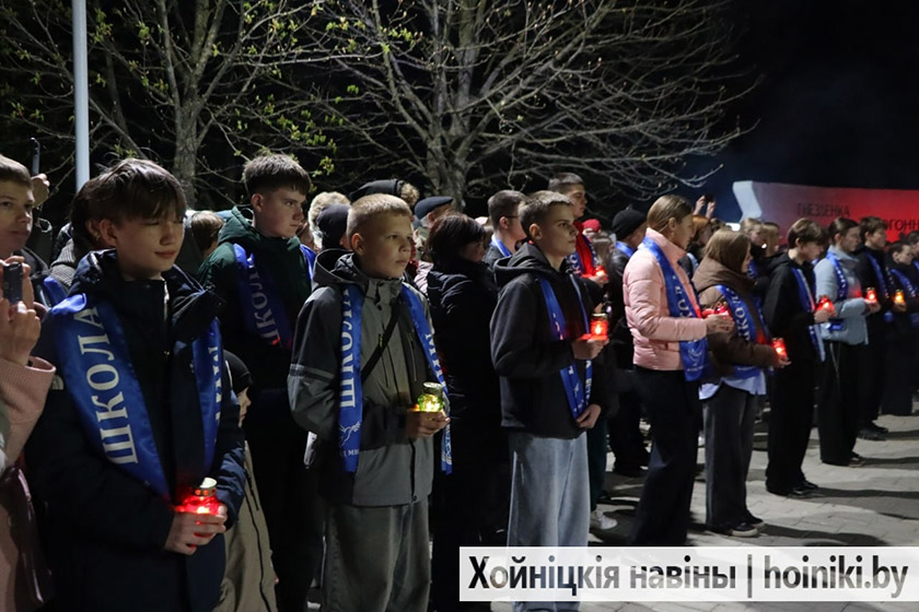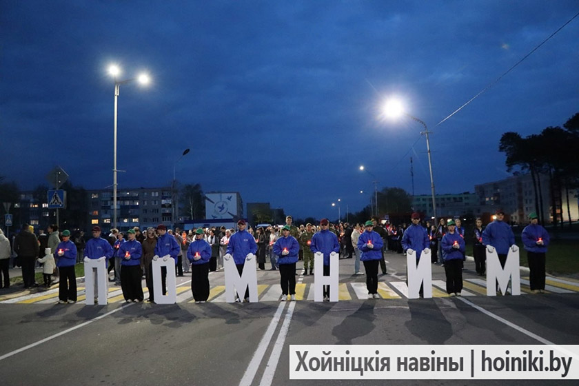 Сотни людей, включая самых юных земляков, несли в руках зажжённые свечи в знак вечной памяти о событии, разделившем нашу историю на «до» и «после». А впереди учащиеся колледжа, активисты БРСМ, несли общий для всех хойничан девиз «Помним».