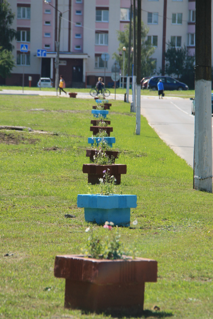 Длинная аллея из цветочных клумб появилась на улице 70 лет Октября города (в сторону магазина «Евроопт»). Бетонные цветочницы коричневого и голубого цвета здесь разместил КЖУП «Хойникский коммунальник».