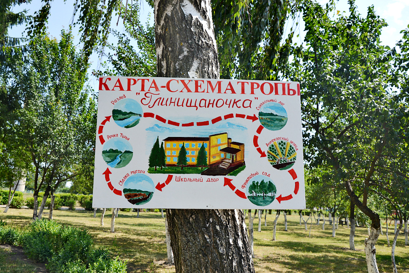 И так, что представляет собой «Глинищаночка»? Маршрут включает в себя 7 станций, расположенных на территории школы и детского сада: «Витамины с грядки», «Зелёная аптека» (растут бадан толстолистный, душица, шалфей, шиповник, чабер, мелисса), учебно-опытный участок «Отдел бахчевых культур», «Фруктовый сад», «Растительный и цветочный мир школы» (цветочная фауна насчитывает 25 видов цветов и более 20 видов деревьев), «Речка «Турья», «Берёзовая роща».