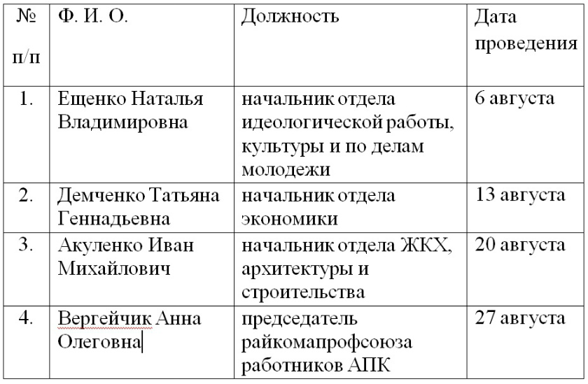 График проведения «прямой линии» с управлениями и отделами райисполкома в августе 2020 года