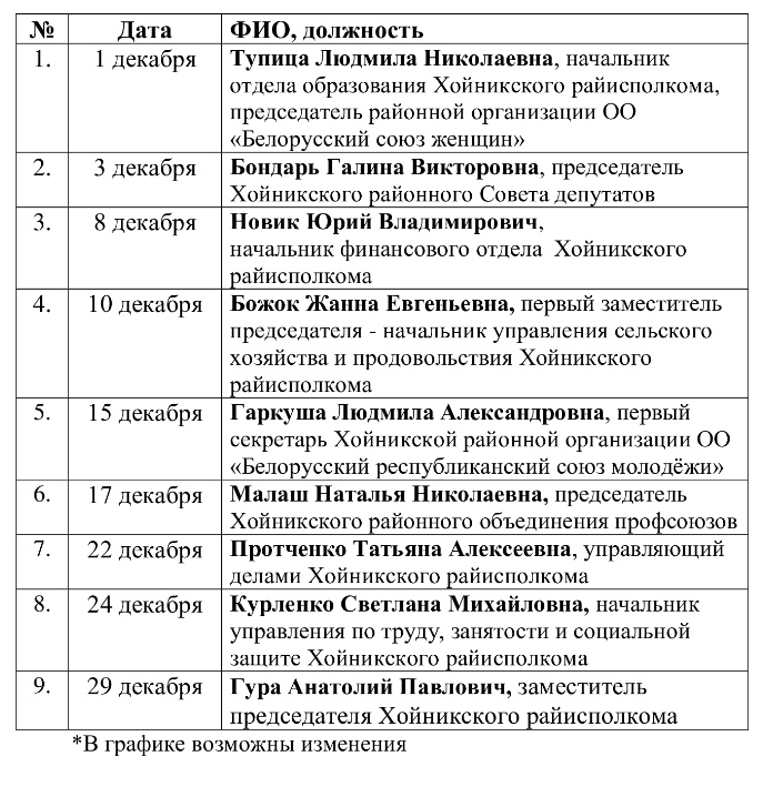 График работы* общественной приёмной при Хойникском районном исполнительном комитете на декабрь 2020 года