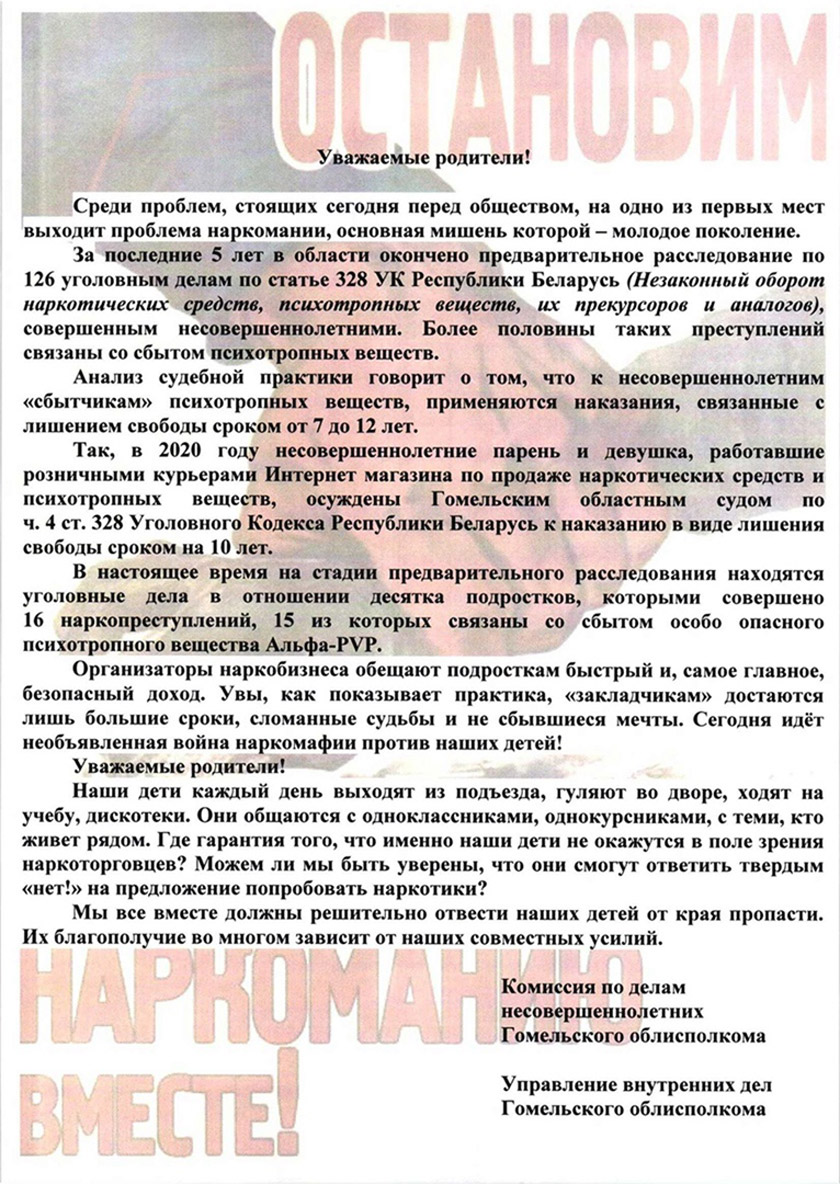 Обращение комиссии по делам несовершеннолетних и управления внутренних дел Гомельского облисполкома к родителям