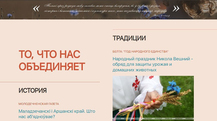 В рубриках «Традиции» и «Творчество» собраны материалы, посвященные народным обрядам и обычаям, умениям мастеров, которые передавались из поколения в поколение, а также рассказывается о современных талантах белорусов.