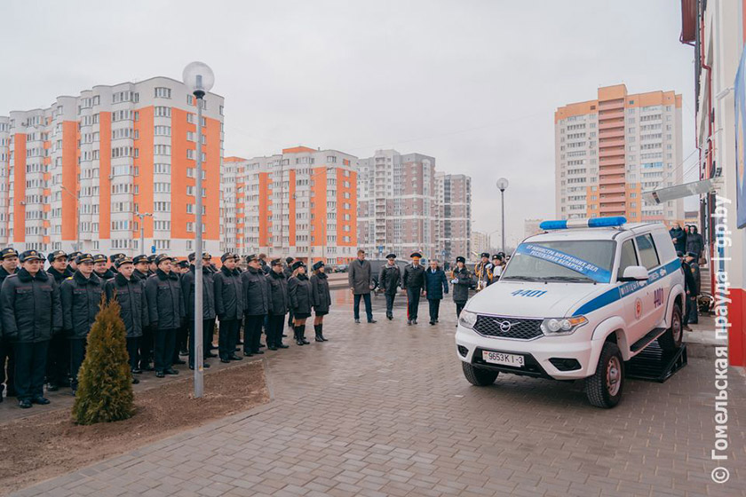 В этом помещении еще в 2008 году началось строительство пожарного депо. Потом процесс приостановили, а позже запланировали разместить депо только в восточной части здания. Ее выделили в отдельный пусковой комплекс, где и располагается сегодня подразделение МЧС. В 2018 УВД облисполкома решило завершить строительство в западной части здания и разместить в нем ОВД администрации Центрального района Гомеля. Новая прописка значительно сократит время реагирования на происшествия, так как теперь ОВД находится в центре района – на улице Головацкого, 135. Сотрудники милиции получили награды, а также подарок – автомобиль.